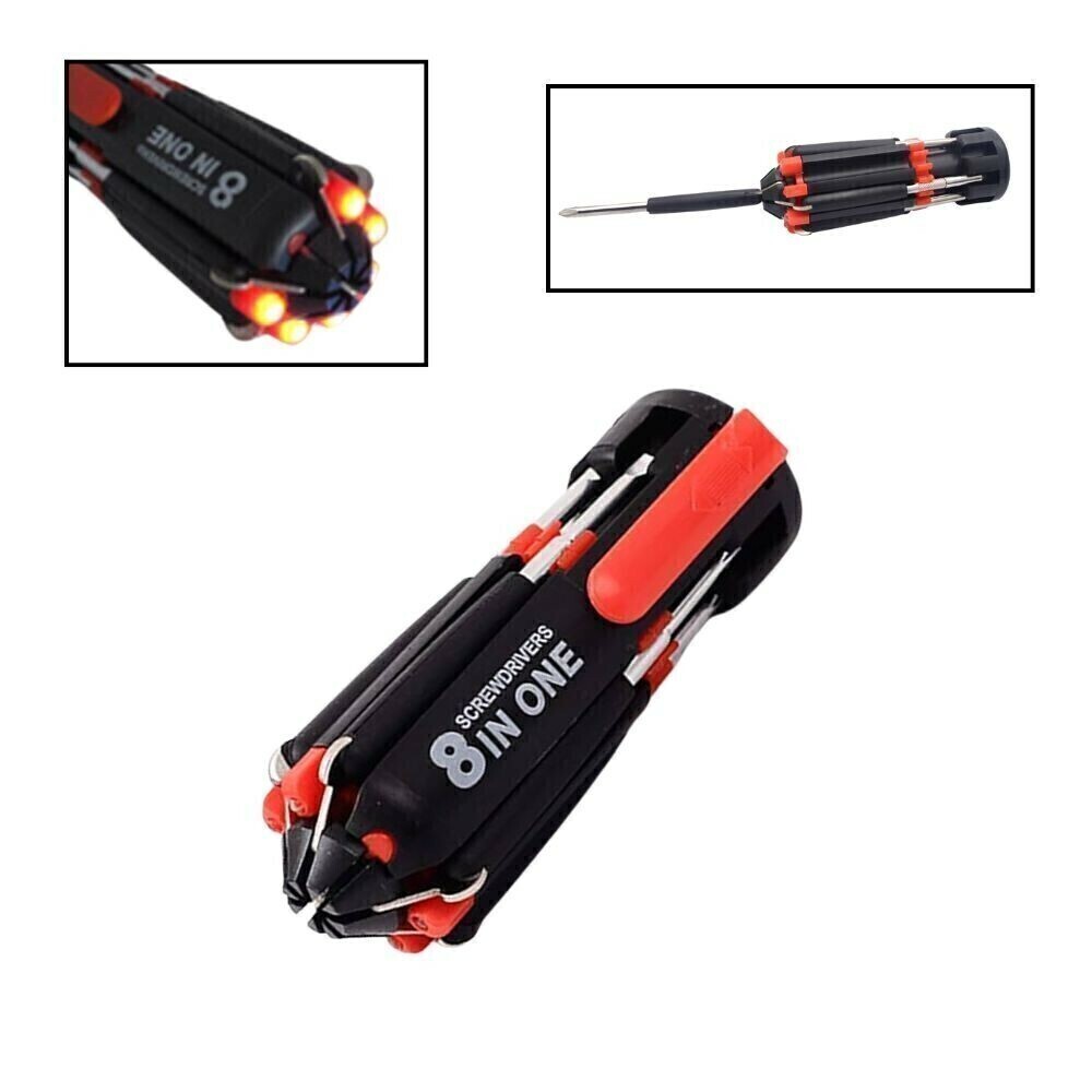 Destornillador 8 en 1 con Luz LED ¡Simplifica tus tareas de reparación con nuestro destornillador multifunción 8 en 1! Este diseño compacto te permite tener siempre la herramienta adecuada a mano, sin la necesidad de buscar y cambiar puntas constantemente. El brazo plegable te da acceso rápido a 8 puntas de destornillador, lo que lo convierte en la herramienta perfecta para cualquier trabajo, desde el más sencillo hasta el más complejo. ¿Necesitás trabajar en un espacio con poca luz? No te preocupes. Con la linterna LED integrada podrás iluminar cualquier rincón oscuro, asegurando la máxima precisión. Su diseño ergonómico, ligero y compacto, hace que sea fácil de guardar en tu coche, caja de herramientas, o incluso en el cajón de la cocina. Características Principales: -8 puntas de destornillador en un solo brazo plegable. -Linterna LED integrada para iluminar áreas oscuras. -Puntas magnéticas de aleación de acero CRV. -Mecanismo de bloqueo extra pesado para mayor seguridad. -Asas resistentes y eléctricamente aisladas. Diseño compacto y ligero para fácil almacenamiento. Funciona con 3 pilas AAA.